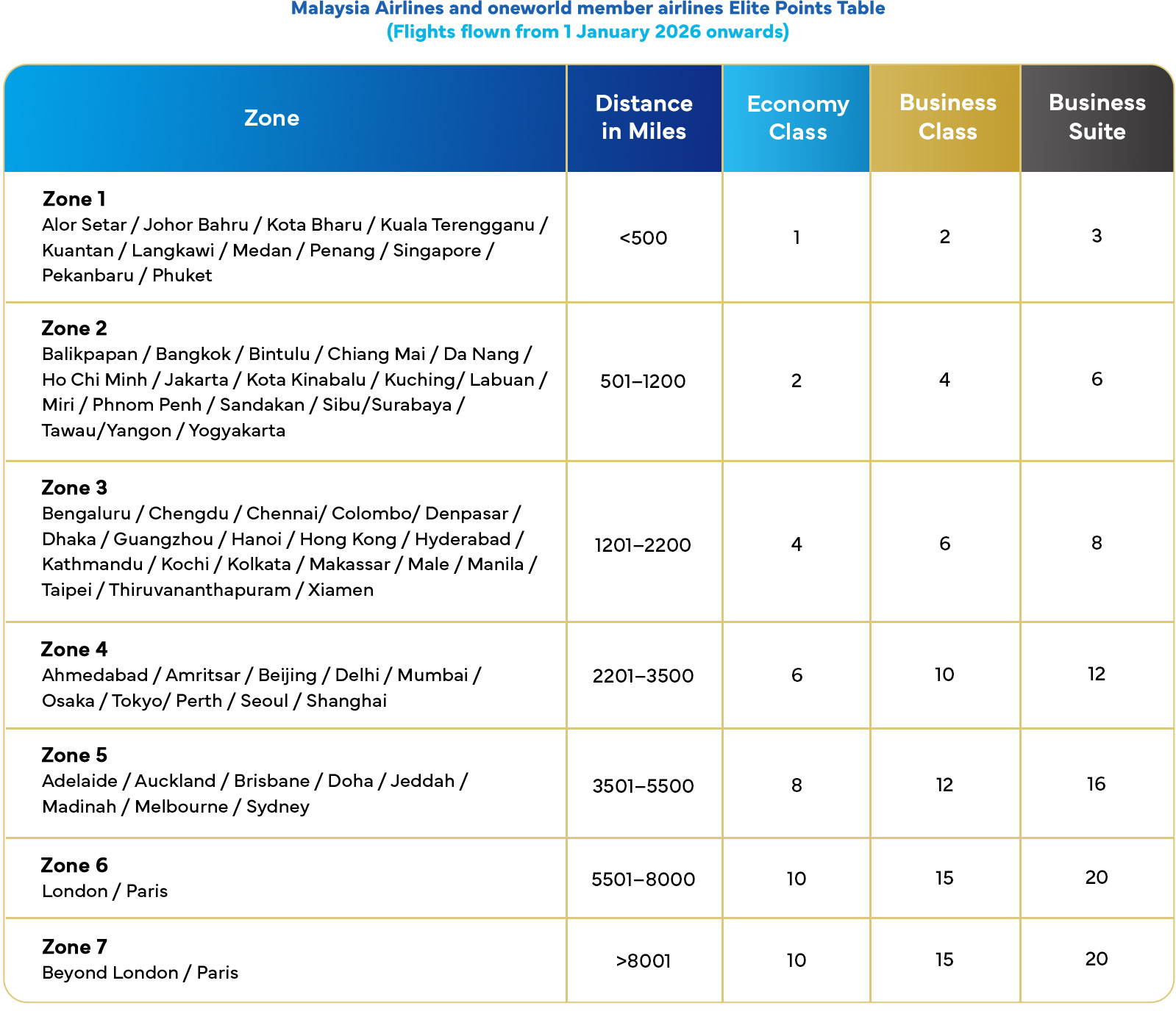 - Elite Points table: Malaysia Airlines, Firefly and oneworld Member Airlines (eligible booking classes).