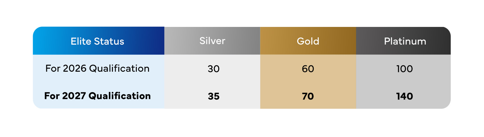 - The revised Elite status requirement (Silver: 35, Gold: 70, Platinum: 140) will determine your status for 2027 qualification.