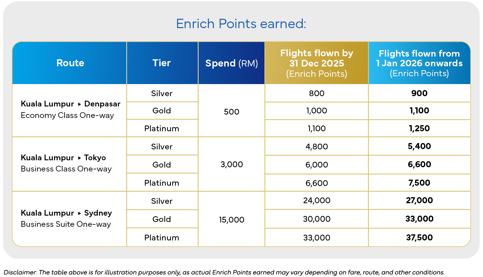 - Enrich Points and Elite Points are credited based on completion of travel date, not at the booking date. Flights flown on or after 01 January 2026 will earn points under the enhanced structure.