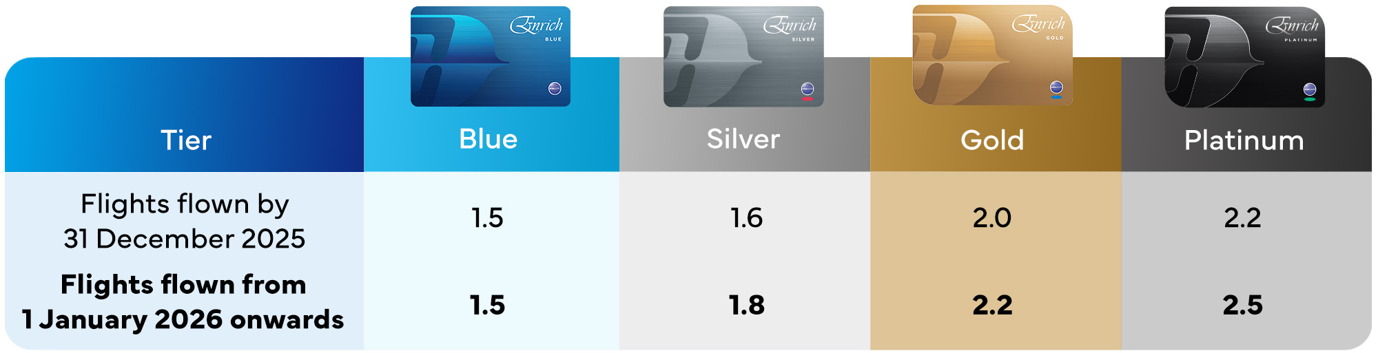- Your existing Enrich Points remain valid until expiry. The updated multipliers apply only to Enrich Points earned from flights flown on or after 01 January 2026.
