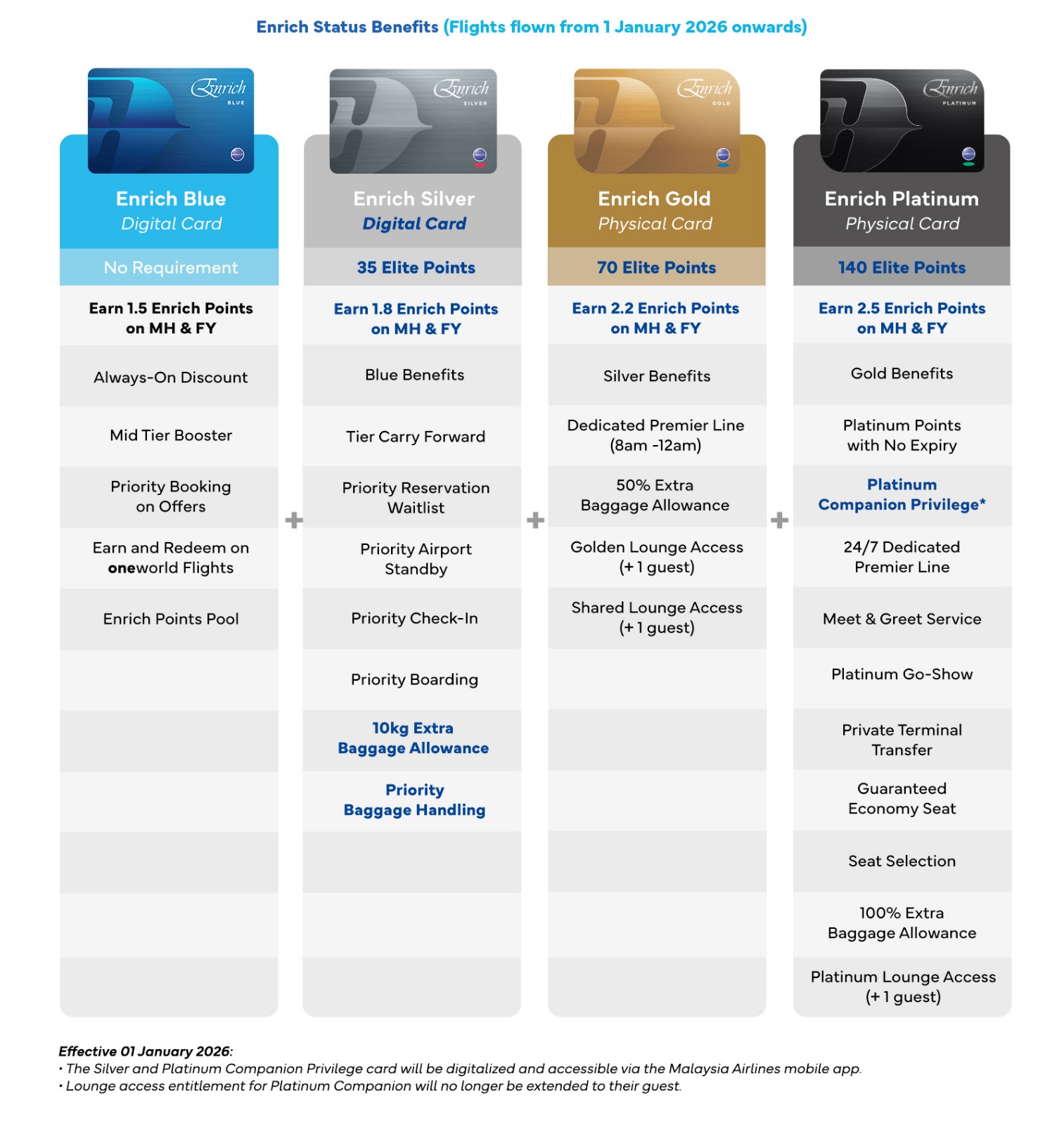 - Enrich Points earning multiplier, Elite Points earning table, revised Elite Status requirements for 2027 qualification, and updated Enrich Status Benefits will take effect on 01 January 2026.