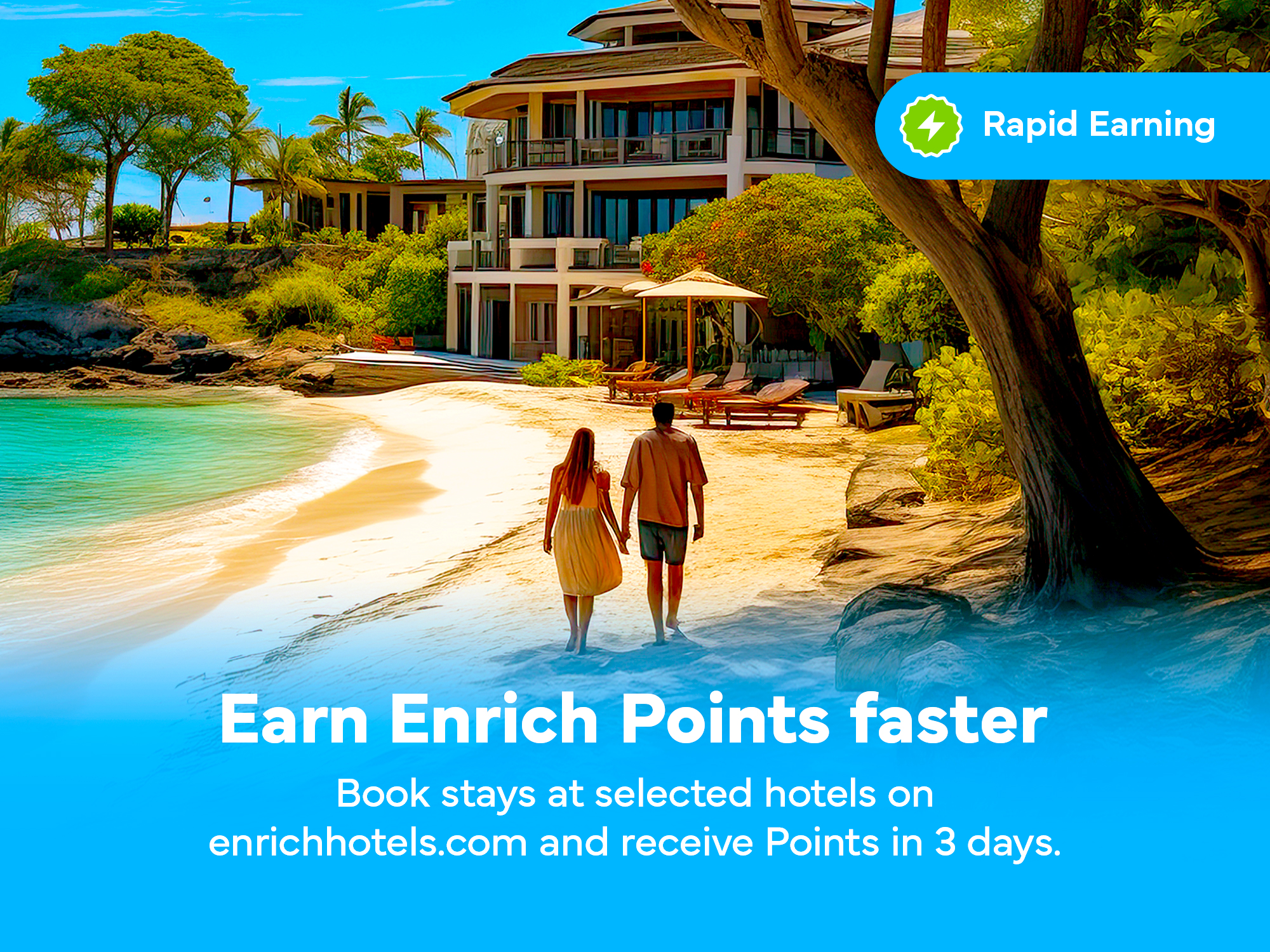 Now, with our latest Rapid Earnings feature, it allows you to receive your earned Enrich Points in just 3 days when you book selected non-refundable properties on enrichhotels.com. These properties are marked with Rapid Earnings icon for your ease and here's how you can spot them:​